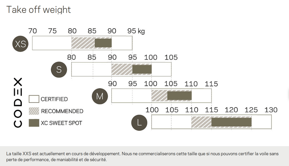 Lors du développement de la CODEX, l'exigence était non seulement de produire de la performance vraiment utilisable, mais aussi une manipulation pratique ; de la simplicité du décollage à la facilité de pliage. Les joncs en nitinol du bord d'attaque résistent mieux à la torsion, ce qui permet de réduire le volume de pliage. La CODEX est livrée en standard avec le Concertina Bag Light, mais pourra très bien s’adapter avec votre sac de pliage habituel. Grâce à sa construction semi-light, 4,2 kg en taille XS (PTV : 70-95 kg), la CODEX est à la fois robuste et compatible avec la pratique du Hike & Fly.